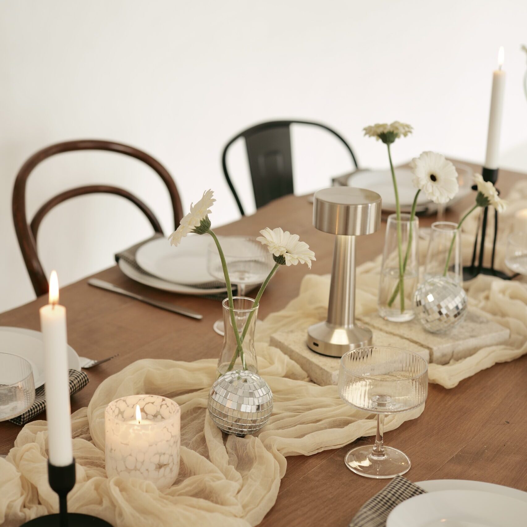 Csak pár szál zöld növény és a kristálytiszta víz a lombikokban. Nem muszáj sok virág ahhoz, hogy megkapó legyen a dekor. A kevesebb több.
