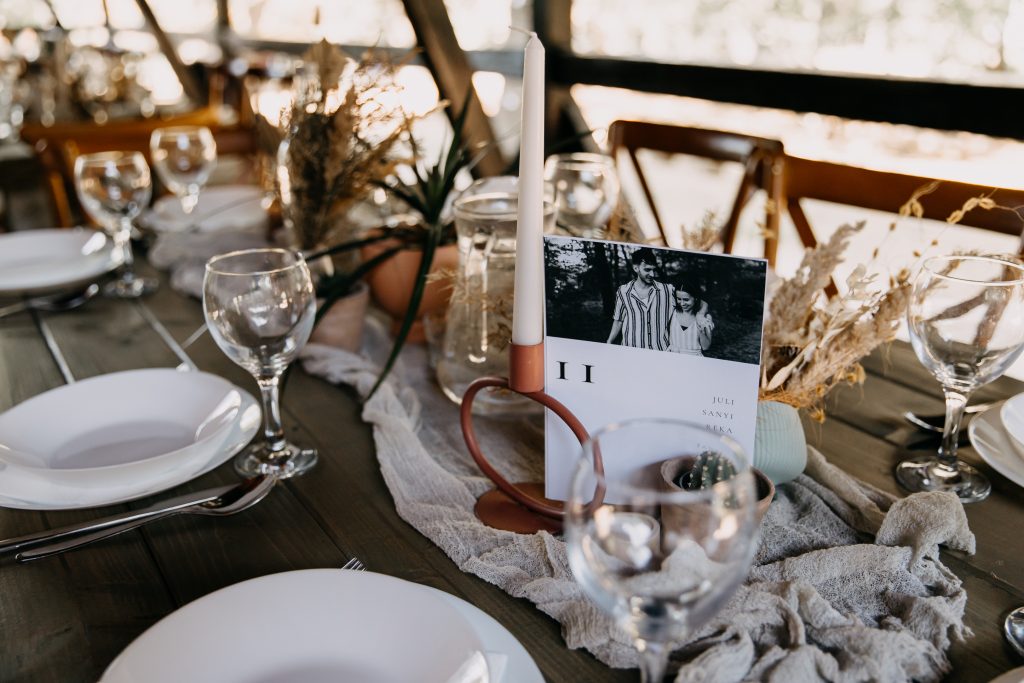Az alap dekorcsomagot ők még feldobták azzal, hogy az asztalszámozásnál saját fotóikat is felhasználták, ezzel teljesen egyedivé téve a dekorációt.