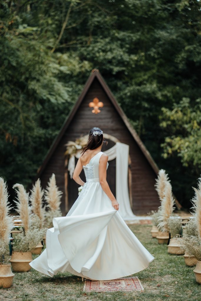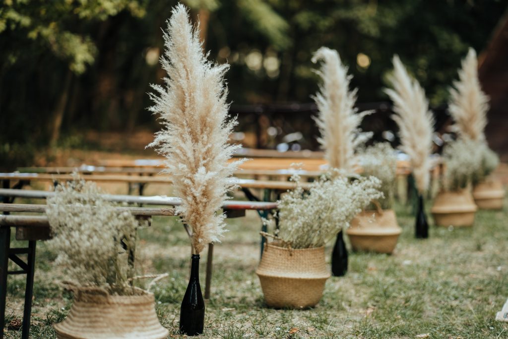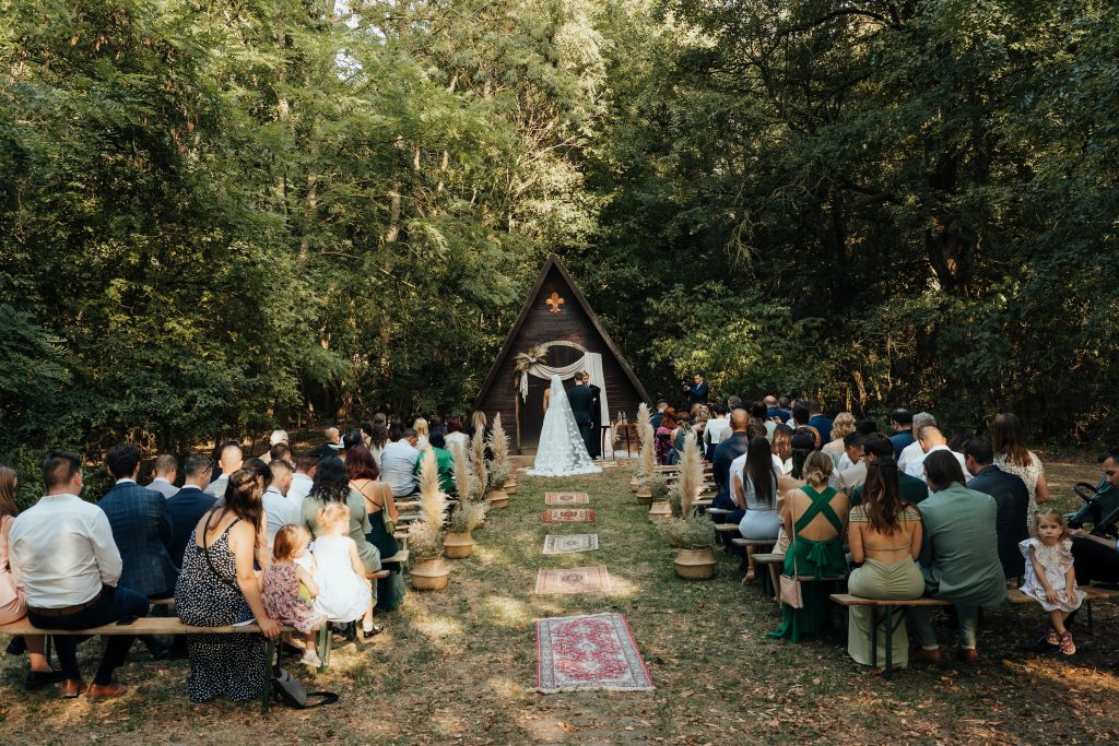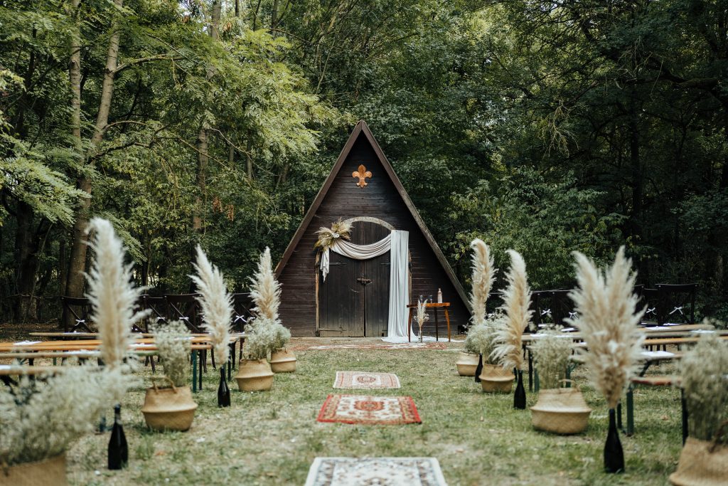 Kitty és Máté a Sztrilich Pál Cserkészparkba vitték a MATCHA csomagot. A helyszínen családtagok és barátaik segítettek a díszek kihelyezésében. A szertartáshelyszínűkön a kápolna ajtaját dekorálták a boldogságkapudísszel és textillel. A bevonuló útra még plusz extra dekorációt is kigondoltunk Kittyvel: szőnyegeket és jó néhány gyékénykosárnyi rezgőt választottunk. A nagy üvegbe pampafű is került, így igazán látványos lett a végeredmény.