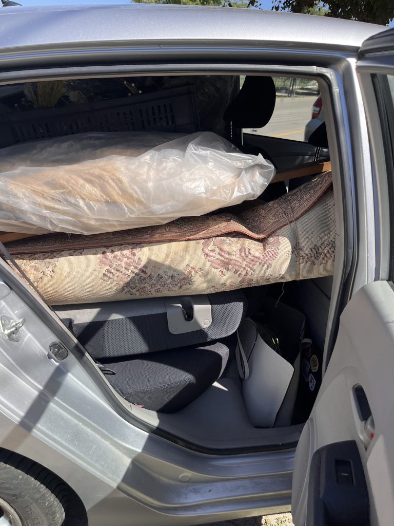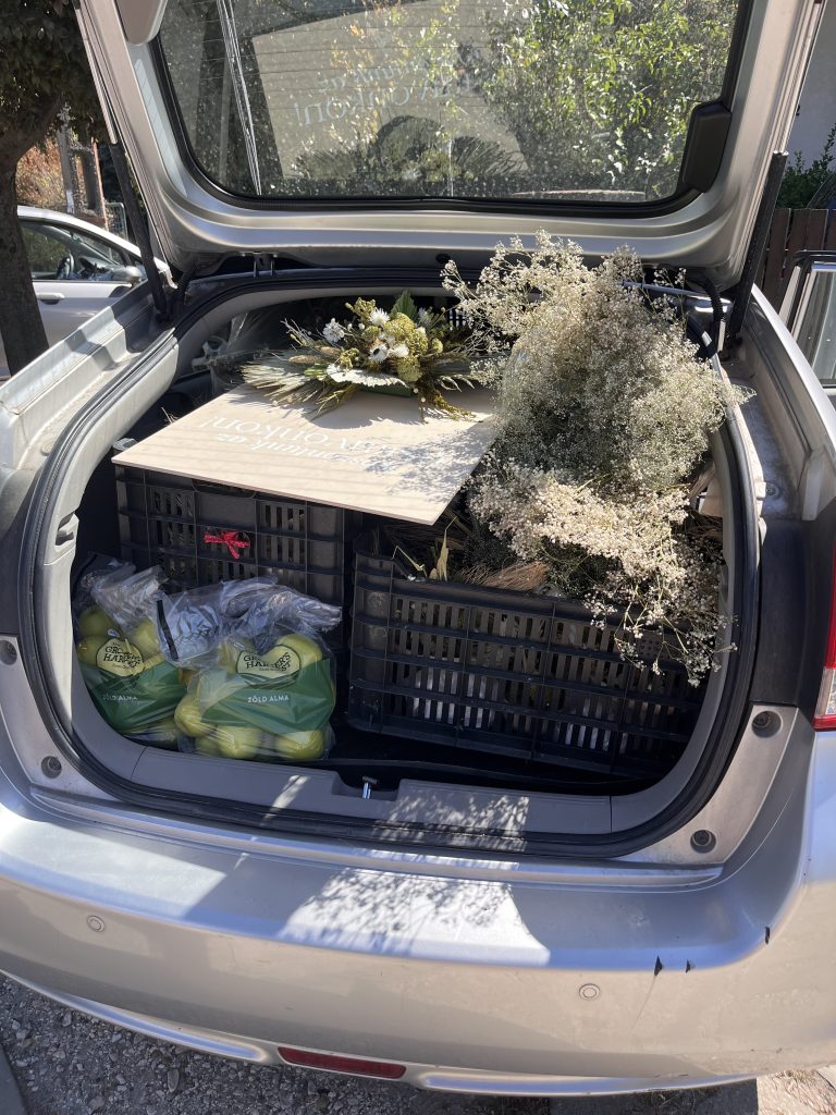 A dekorcsomagért Kitty jött el a műhelyemhez, ketten pakoltuk púposra az autóját. Nekik az alapcsomagon felül azért elég sok kiegészítőt beterveztünk, így a kocsijába épphogy minden befért, szinte egy gombostűt sem lehetett volna már betenni. A 300 x 230 cm-es feltekert nagyszőnyeg beimádkozása után azért kifújtuk az addig beszorult lélegzetünket, és megnyugodtunk, hogy a többi már gyerekjáték lesz. És végül tényleg MINDEN befért. 🙂 Ha kíváncsi vagy rá, hogyan, görgess legalulra a „behind the scenes” fotókért.